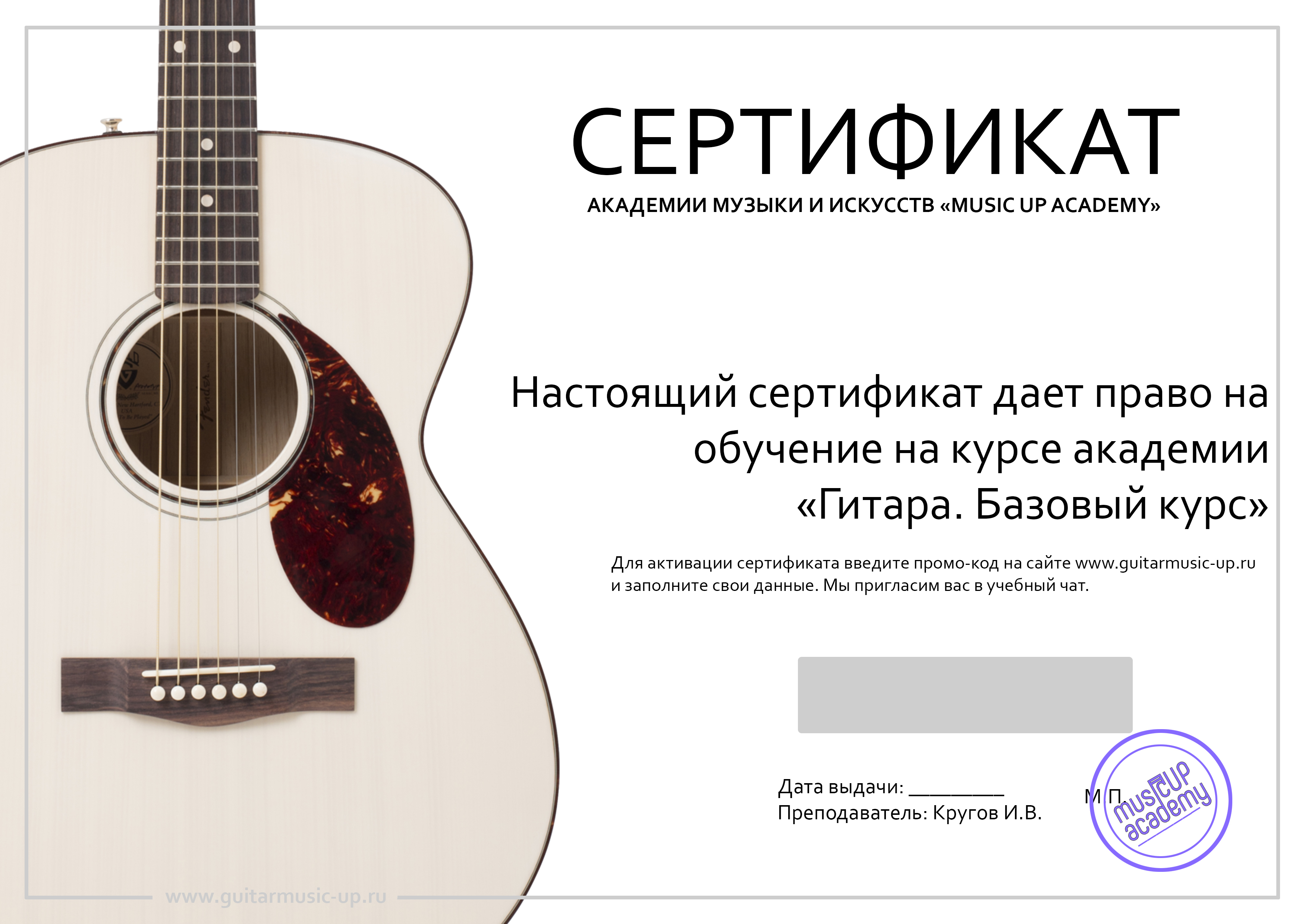 Опыт наших учеников показывает, что, в среднем, занимаясь по 30 минут в день, можно освоить 90% нашего курса. Уже через одну-две недели ученики могут сыграть простые песни и мелодии, а это дает очень сильный стимул развиваться дальше! А если освоите все уроки - то легко сможете играть 99% всех известных песен и композиций! Никакой лишней воды - только нужная поэтапная информация, неизбежно ведущая всех к результату! Всем кто справится с выпускным заданием, отправляем официальный сертификат нашей академии об успешном окончании курса!